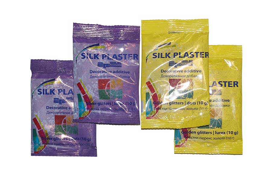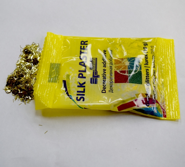 Декоративная добавка в виде блестящих золотых палочек. Как правило, в одну упаковку жидких обоев добавляется один пакетик декоративных блесток.